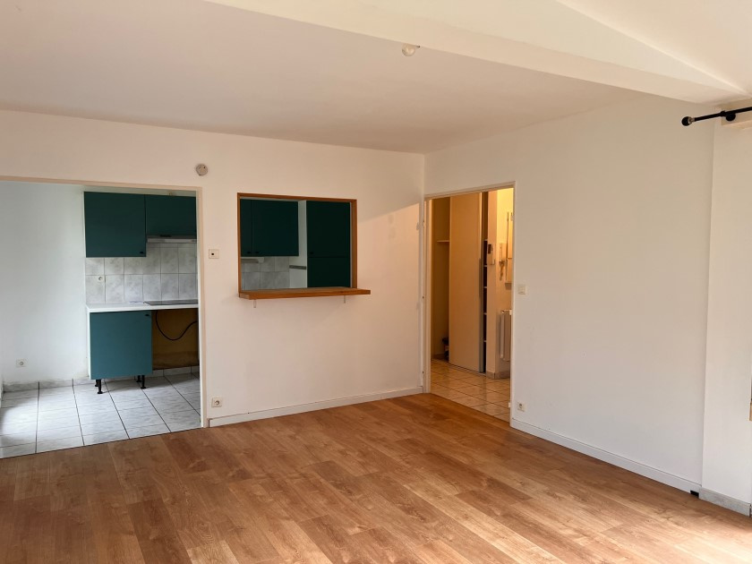 Au rez-de-chaussée : une pièce de vie avec cuisine aménagée et partiellement équipée (plaque, hotte), une entrée avec placard et un WC.