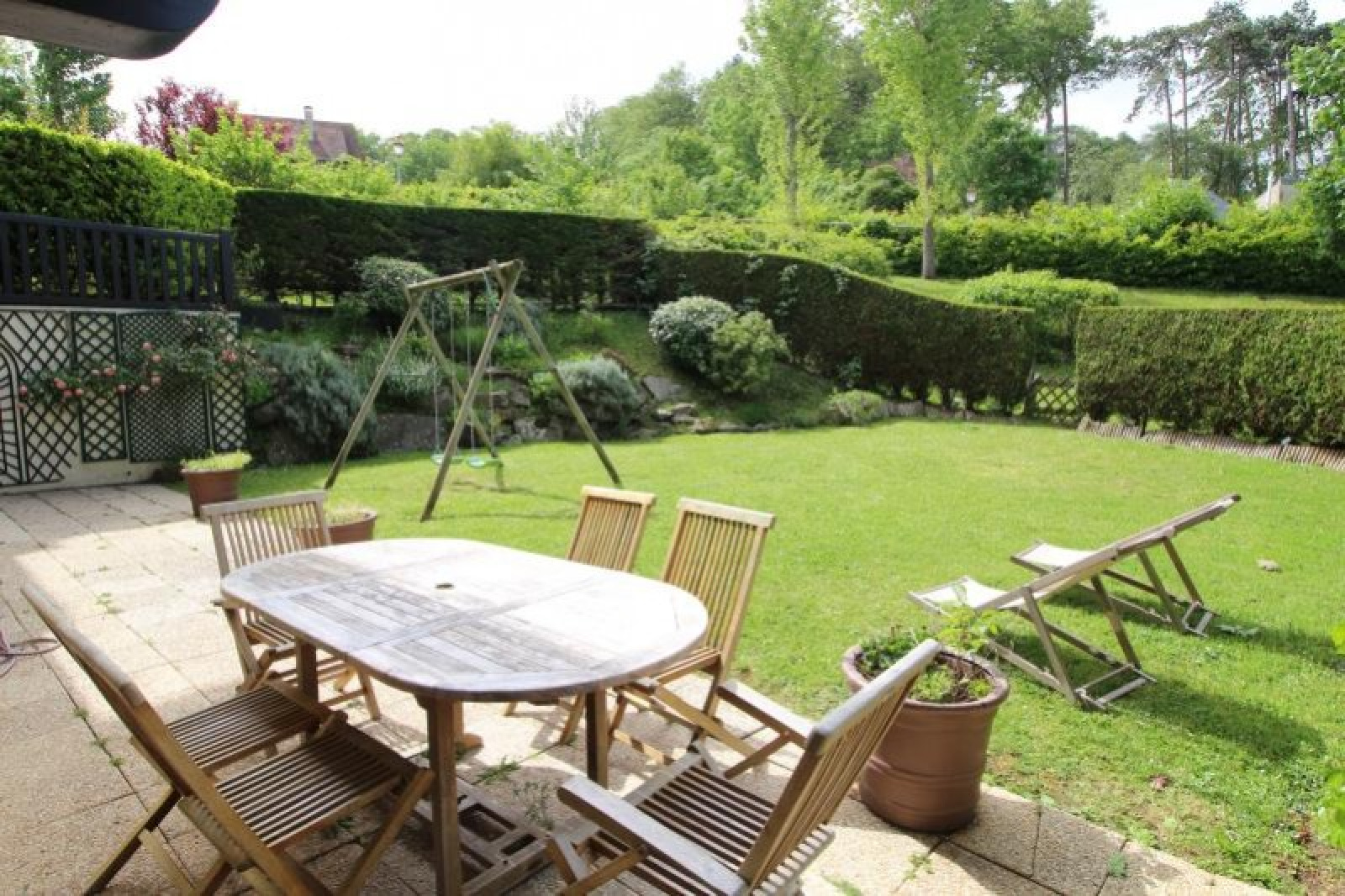 A 15mn à pied du centre de Deauville et de la Plage,~dans belle résidence Normande avec piscine couverte.~Bel Appartement de 4 pièces comprenant : entrée, salon-salle à manger, 3 chambres, grande cuisine aménagées et équipée, 2 salles de douches, wc.~L'appartement donne sur un jardin privatif de plus de 200m² exposé plein sud.~Deux emplacements de parking extérieur.~Bien rare à la vente ... a saisir rapidement ...