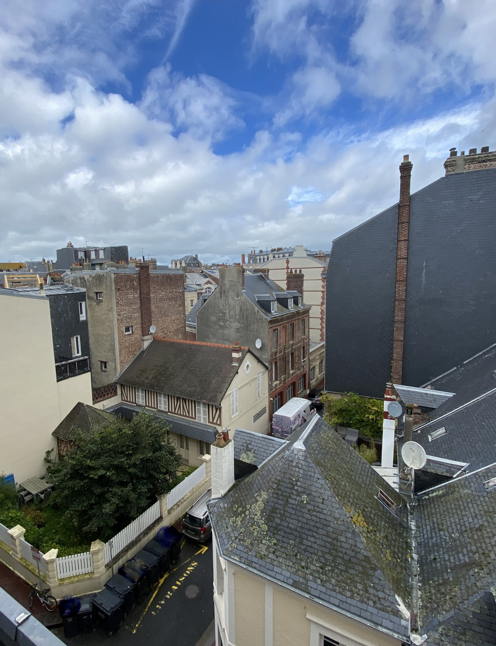 Entre la rue des Bains, la plage et le casino de Trouville sur mer, tout à pied, charmant studio sous mansarde d'une superficie totale de 17.32m², meublé, comprenant une pièce de vie avec cuisine ouverte, deux placards, une salle de douche avec toilette.