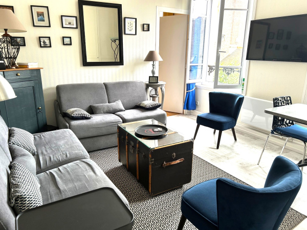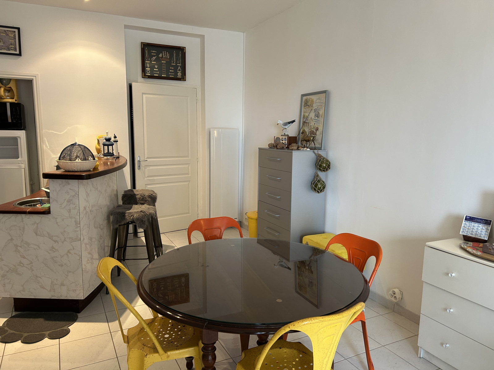 En rez de chaussée surelevé, beau deux pièces, belle hauteur sous plafond 2.82m comprenant une cuisine américaine aménagée et équipée, un salon, salle à manger vue mer, salle de bains avec WC. Une cave de 5m².