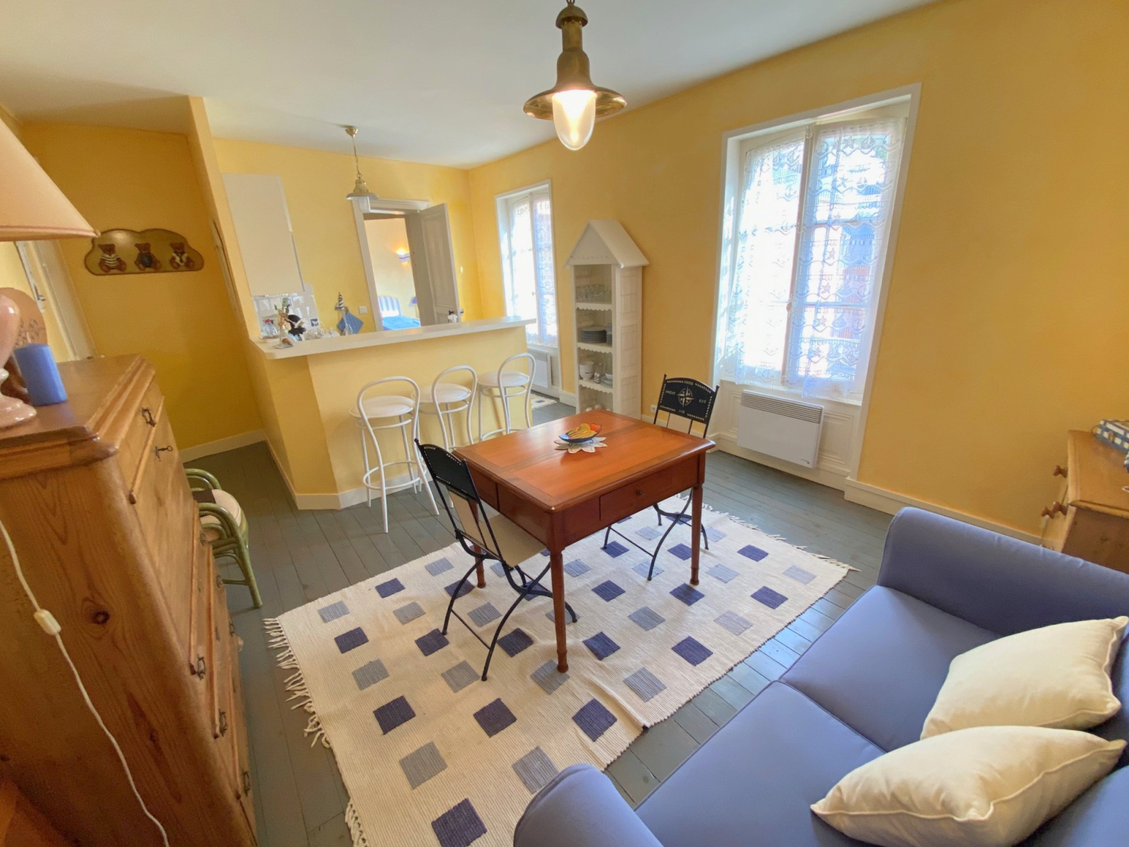 Entre la rue des Bains et le casino, au troisième et dernier étage, appartement deux pièces comprenant une entrée sur pièce de vie avec cuisine ouverte, une chambre avec de nombreux rangements, une salle de douche. Un grenier d'une surface au sol de 6,50m².