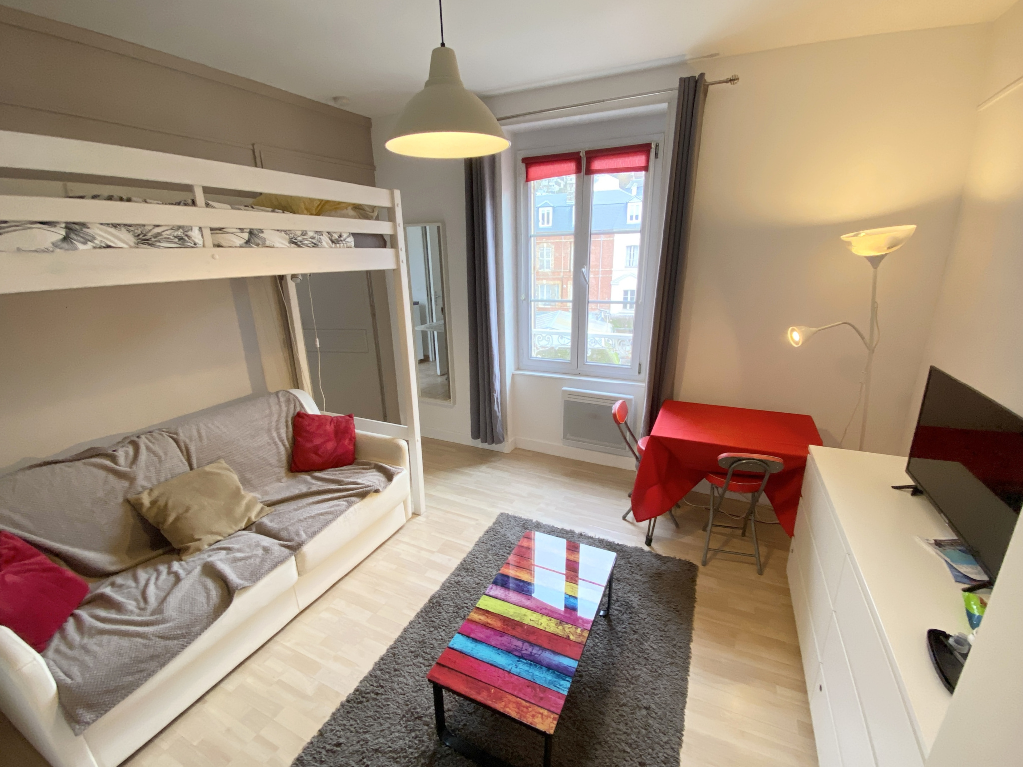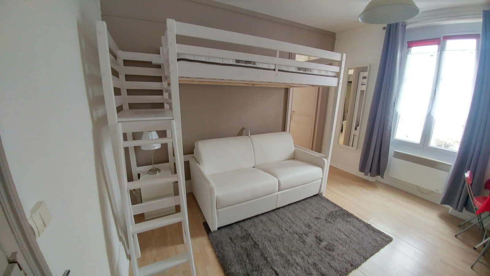 Au coeur de Trouville sur Mer, entre la rue des Bains et le casino, studio meublé, deuxième étage, sur cour intérieure, comprenant une entrée sur pièce de vie, une cuisine séparée, une salle de douche.