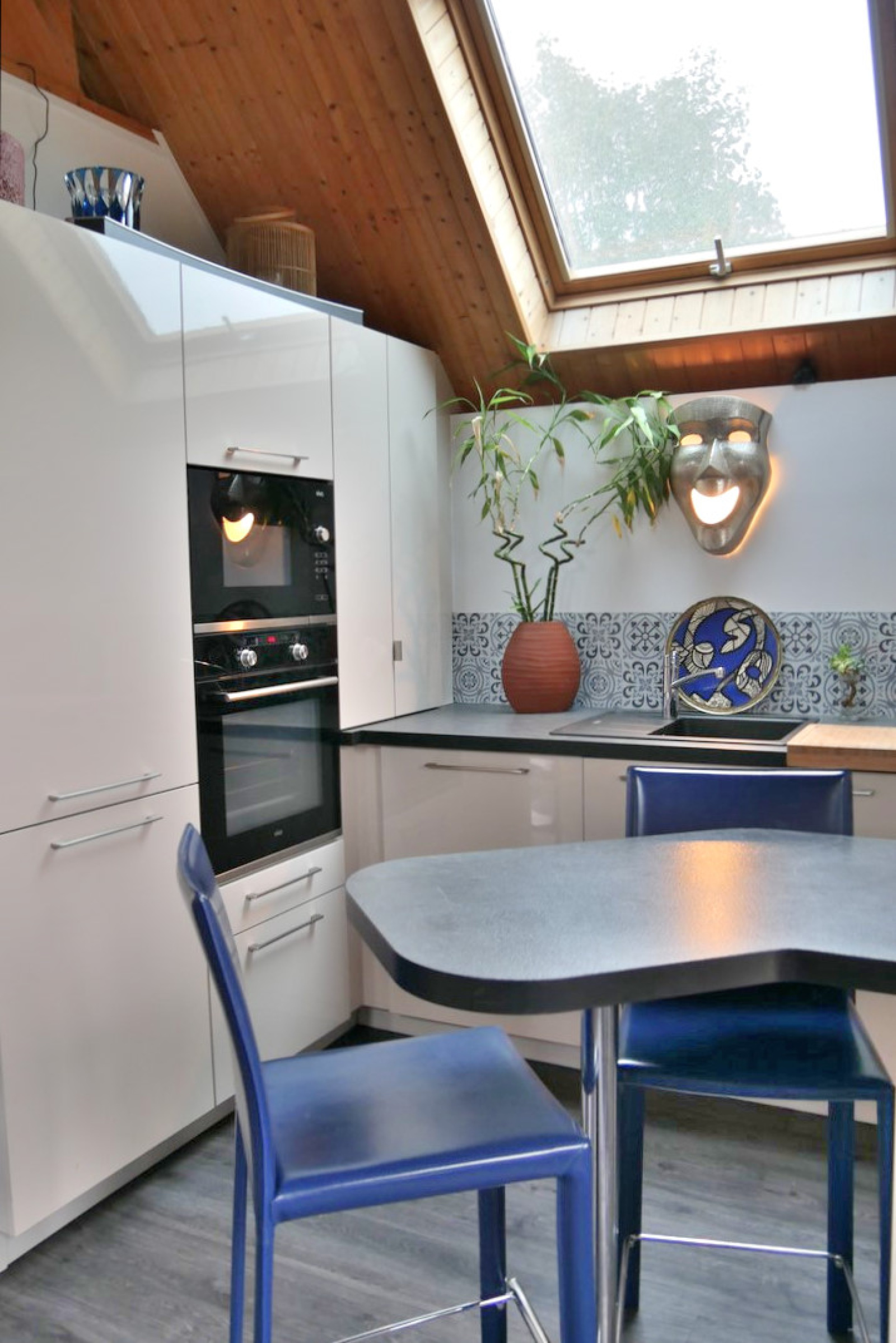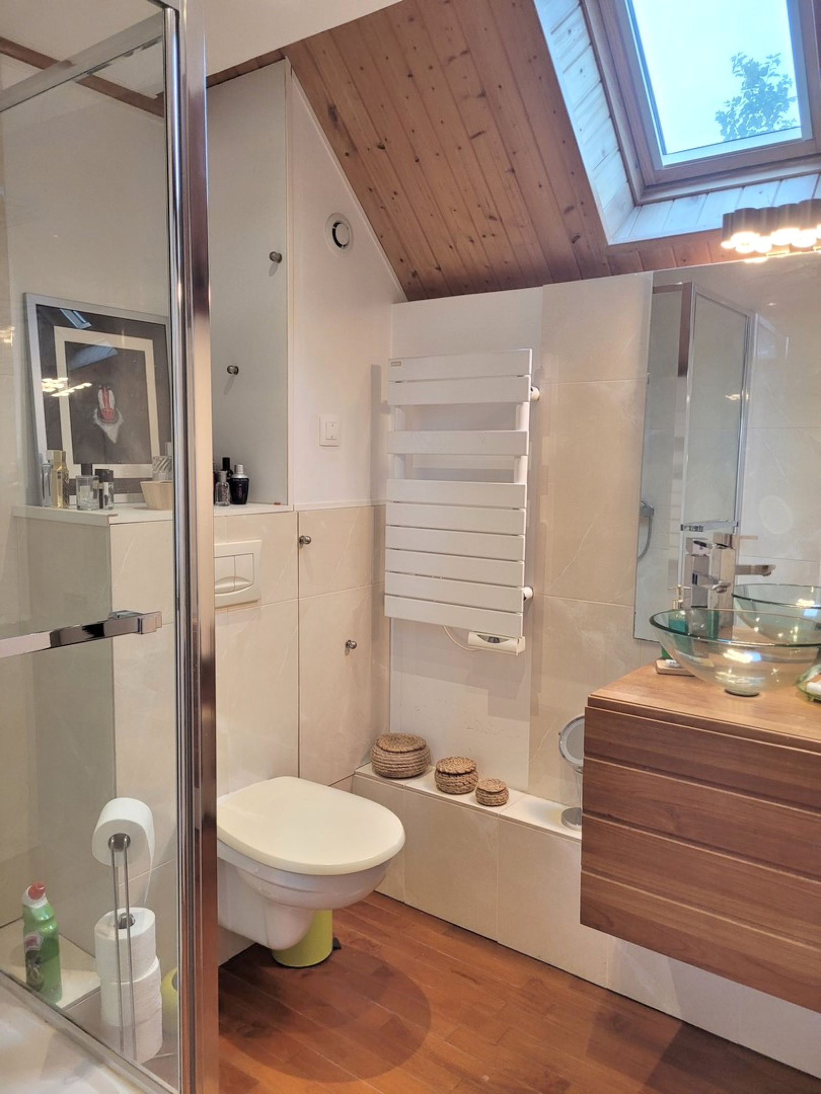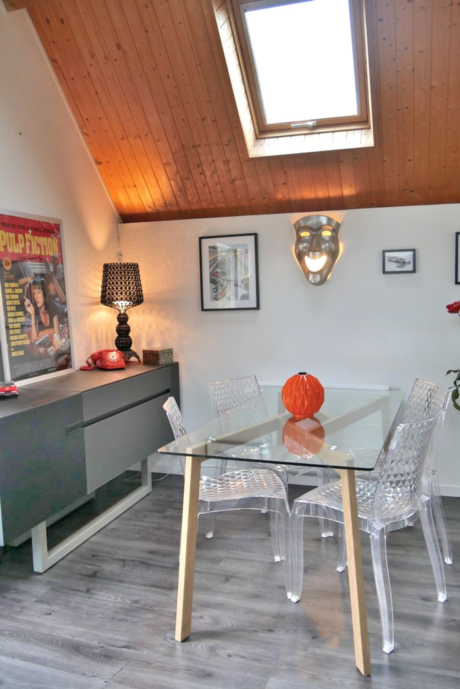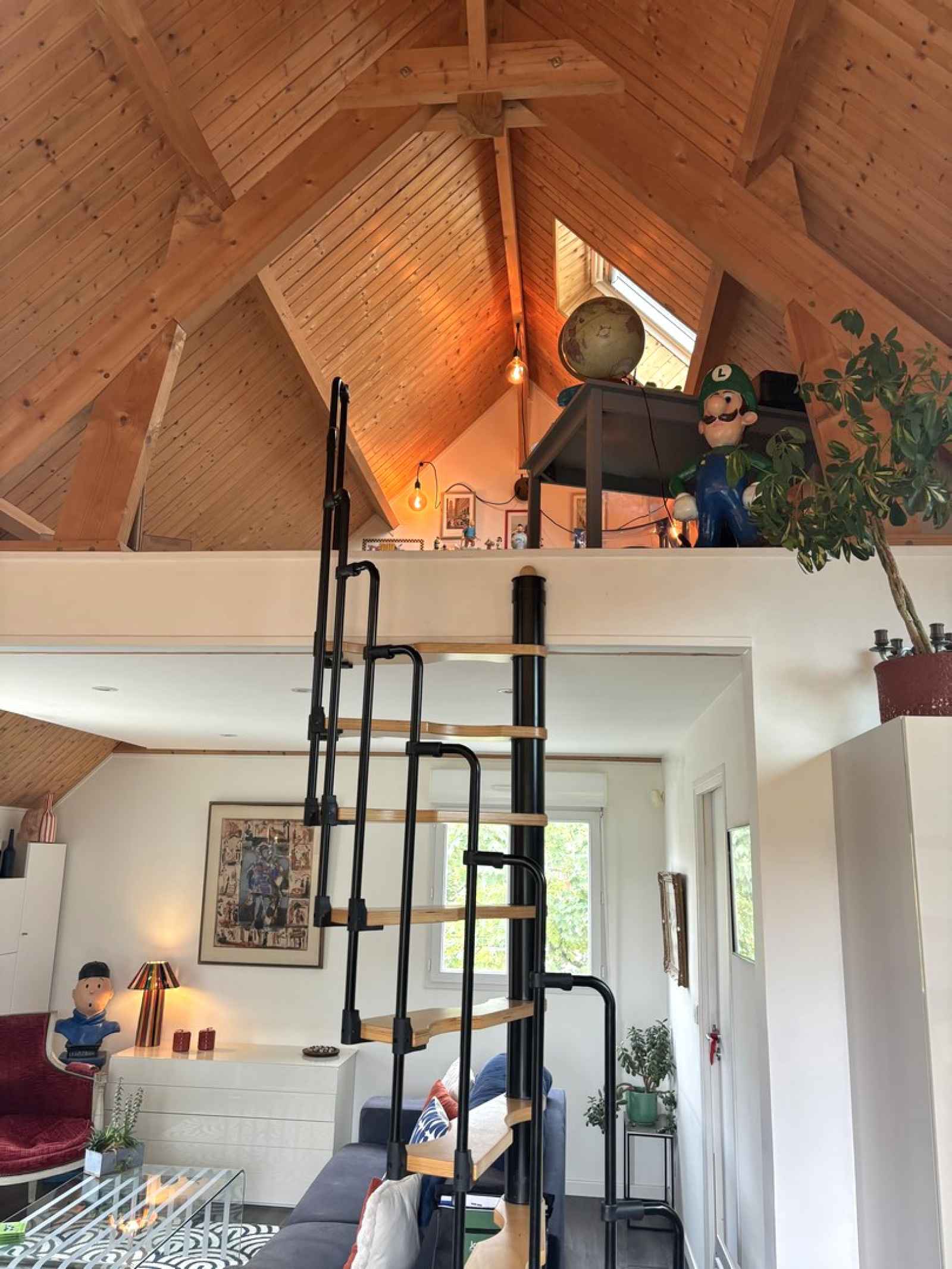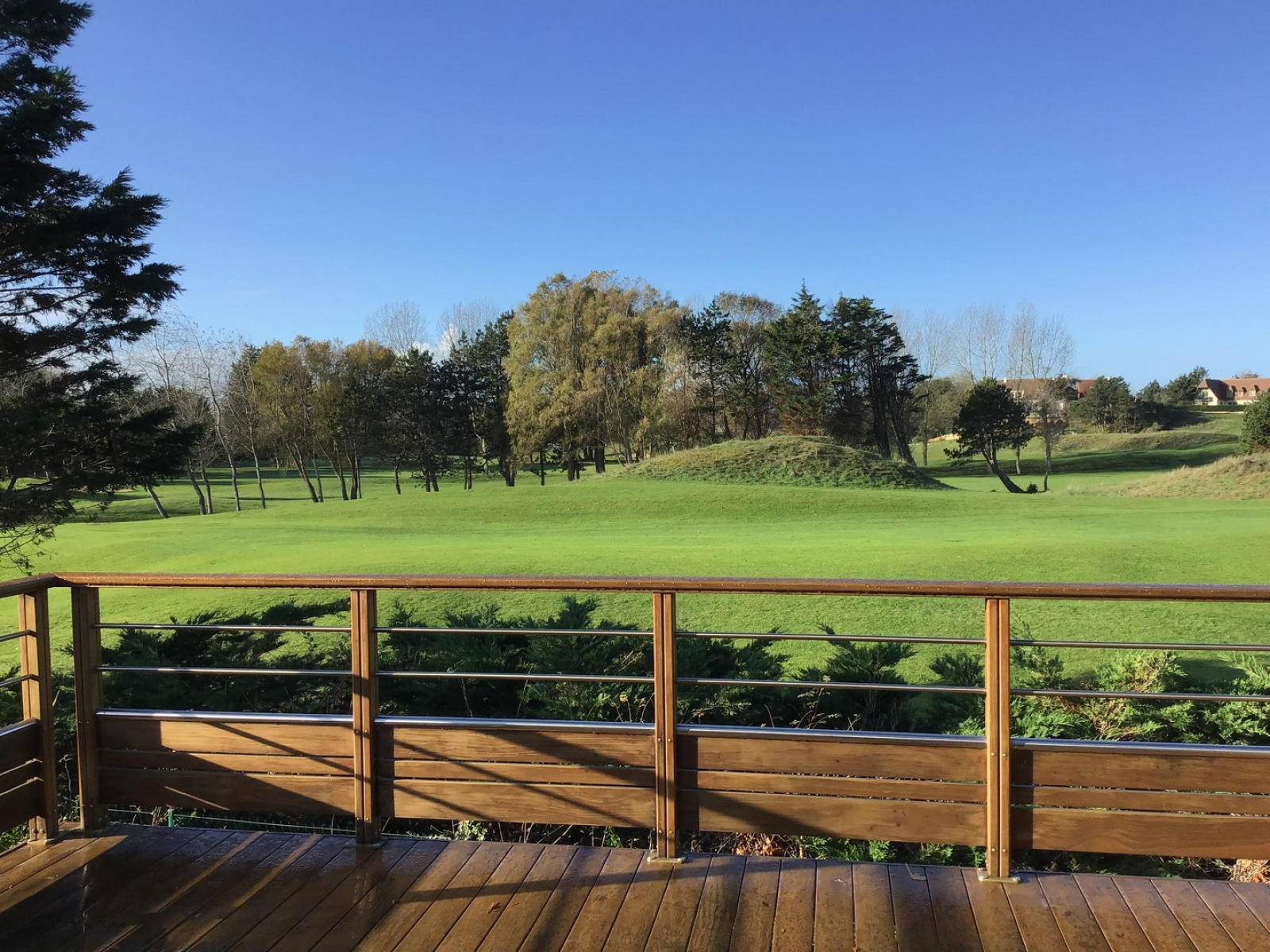 A l'étage : une pièce de vie lumineuse avec cuisine ouverte, une mezzanine pouvant faire office de bureau ou chambre d'appoint et une salle d'eau avec WC. L'étage dispose d'un accès à une terrasse en bois exposée OUEST avec vue imprenable sur le parcours de golf du Home Panorama