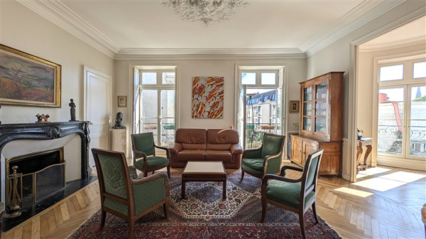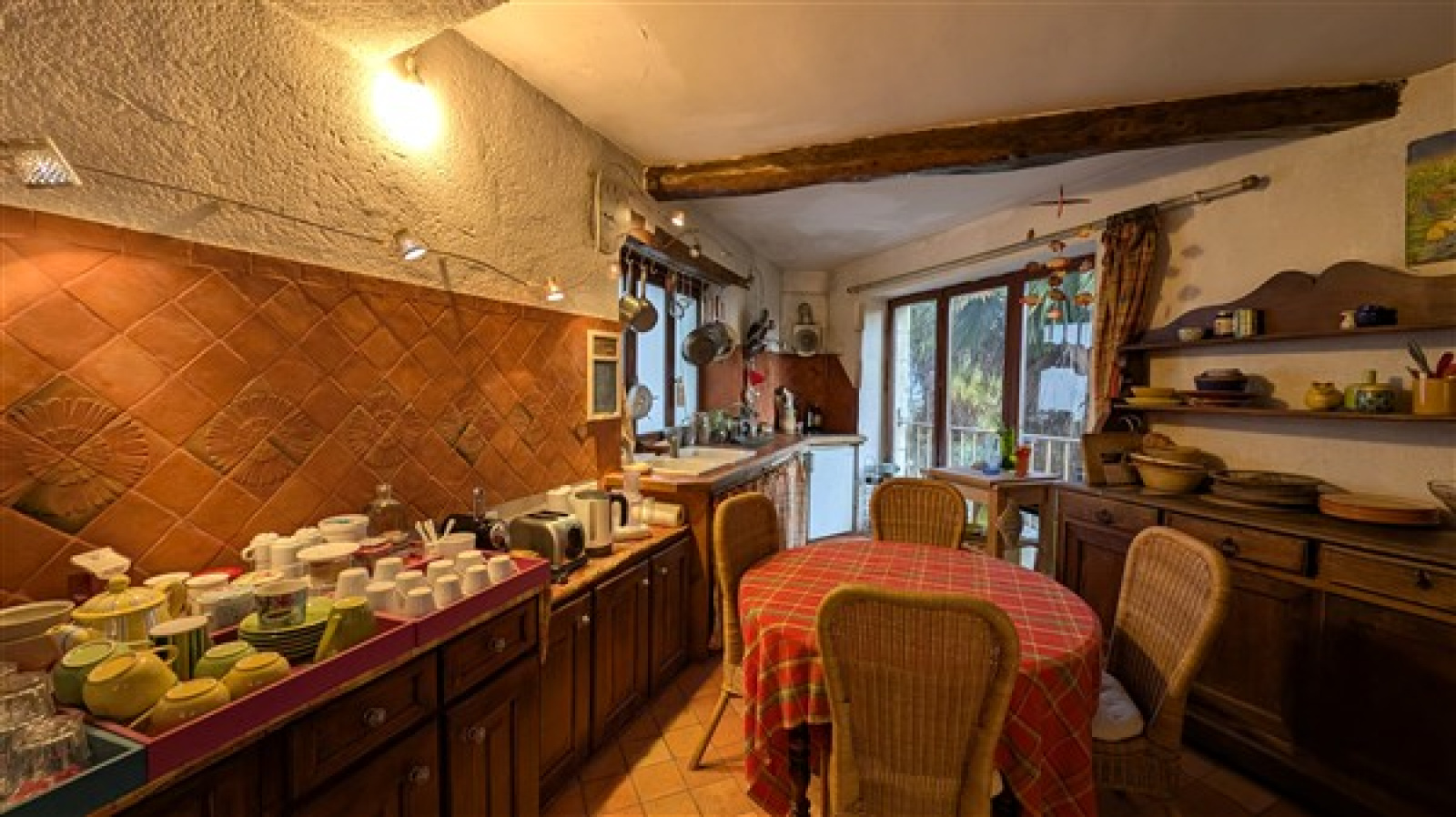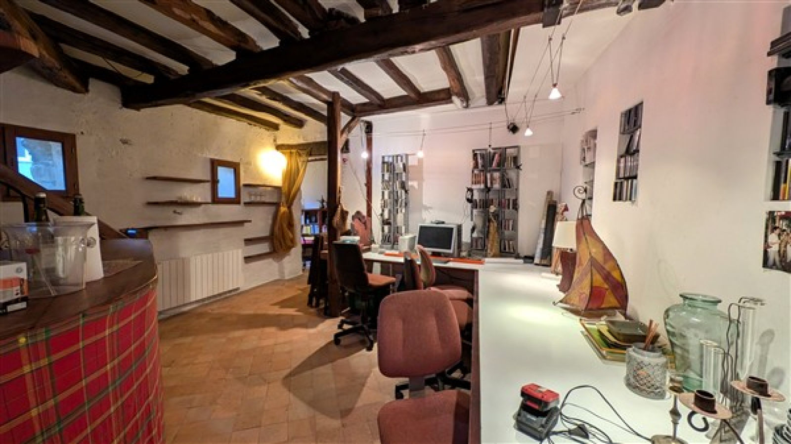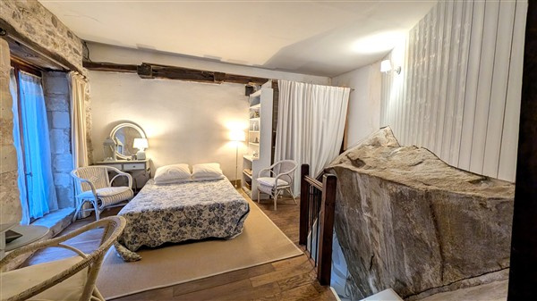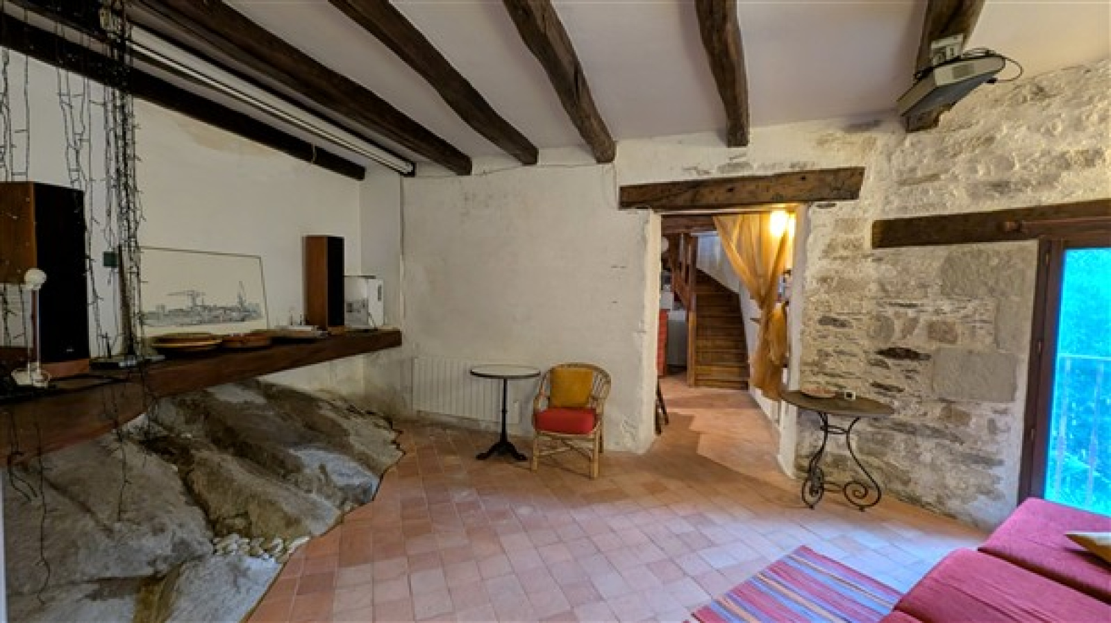 Maison de caractère : murs en tuffeau, poutres, cheminées et belle hauteur sous plafond.