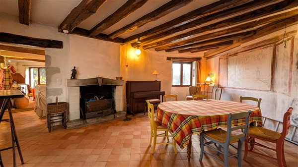 Salle à manger avec cheminée et poutres apparentes.