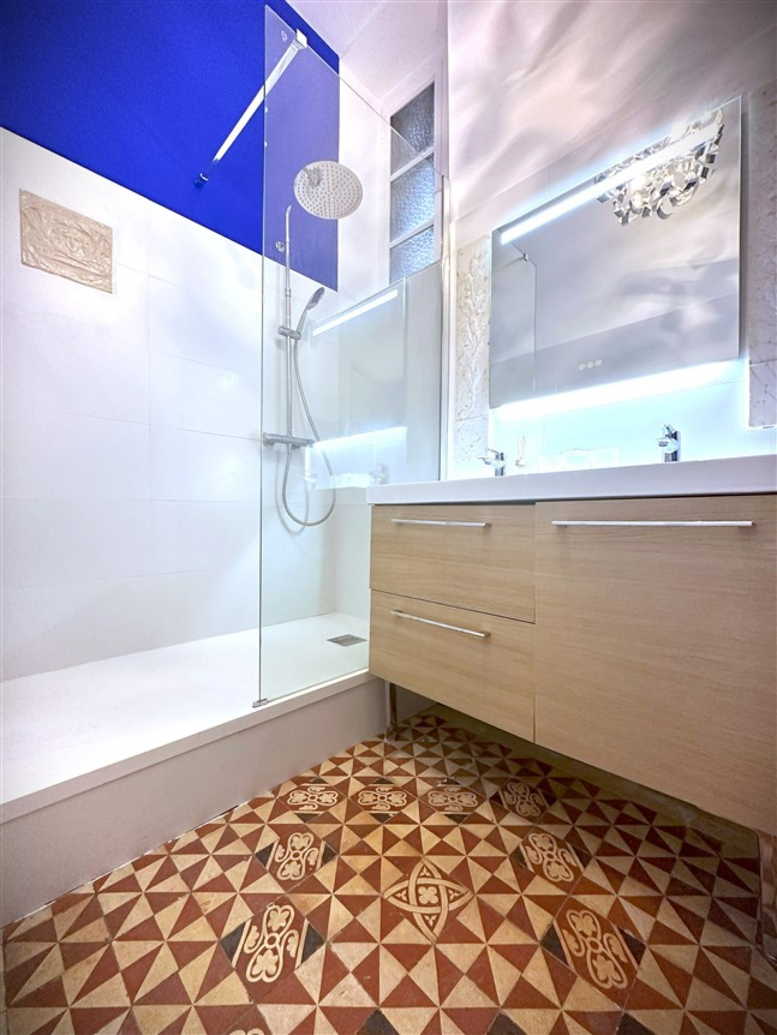 Entrée sur carreaux de ciments, cuisine repas aménagée et équipée,