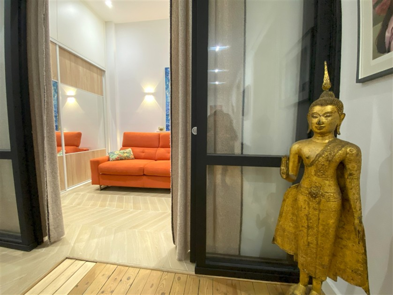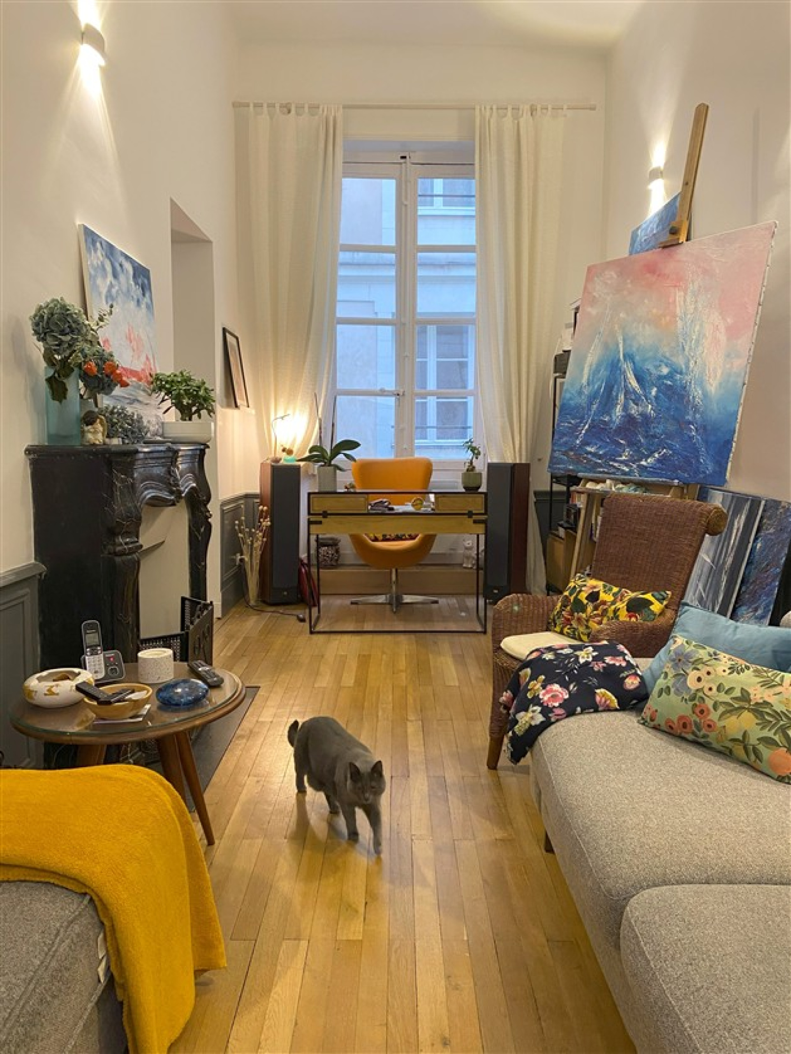 Entrée, salon sur parquet avec cheminée d’époque fonctionnelle,