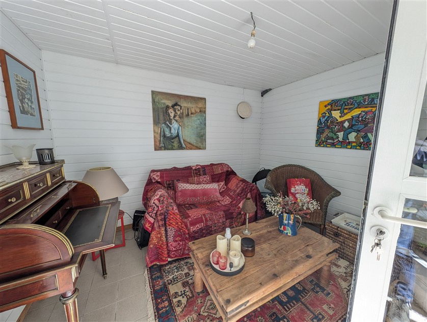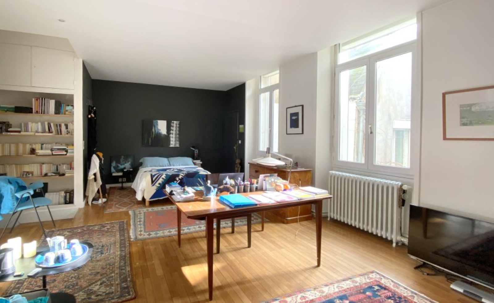 A l'étage : grande chambre avec rangements (2 chambres possibles), salle de bains avec WC et bureau.