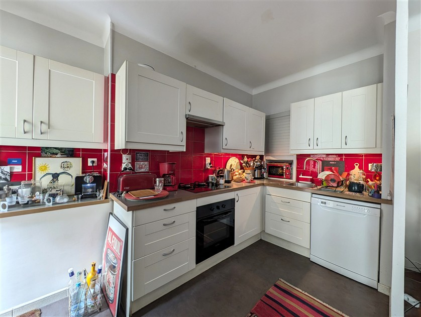 Pièce de vie sur parquet avec cuisine ouverte aménagée et équipée.