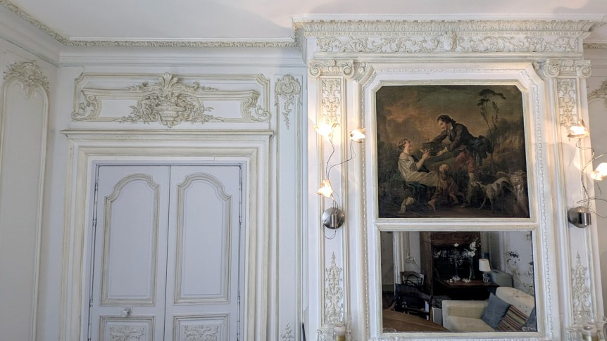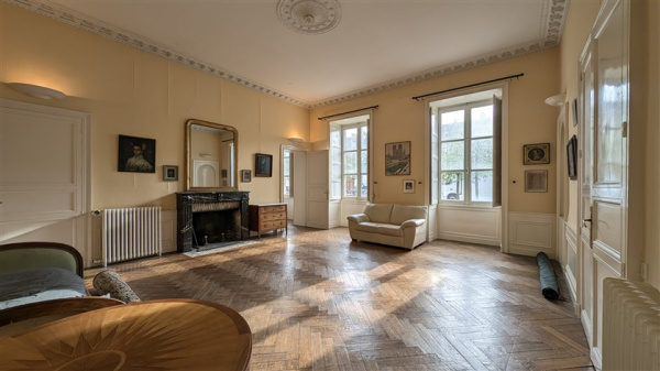 Entrée, double réception sur parquet avec cheminées et moulures,