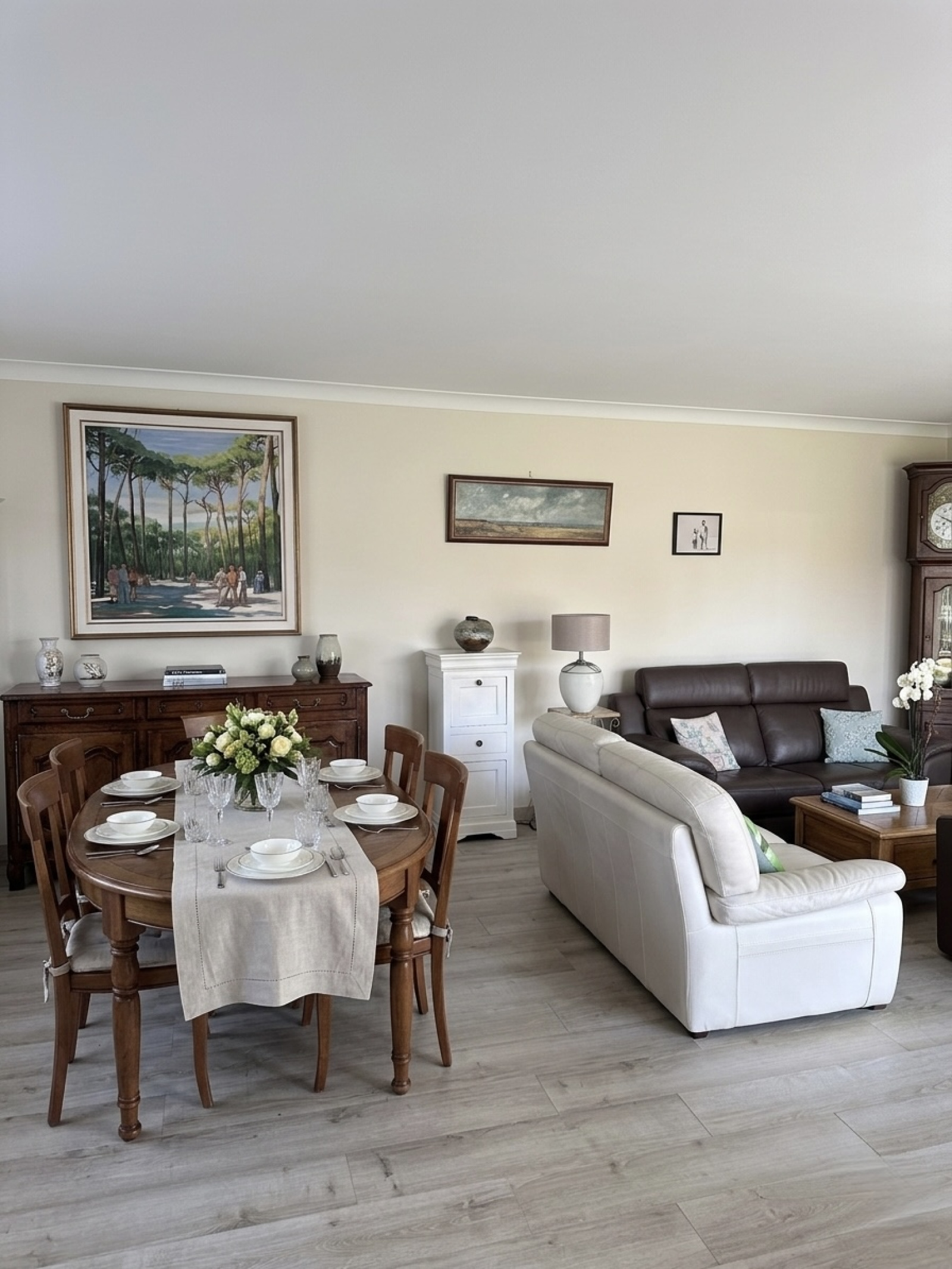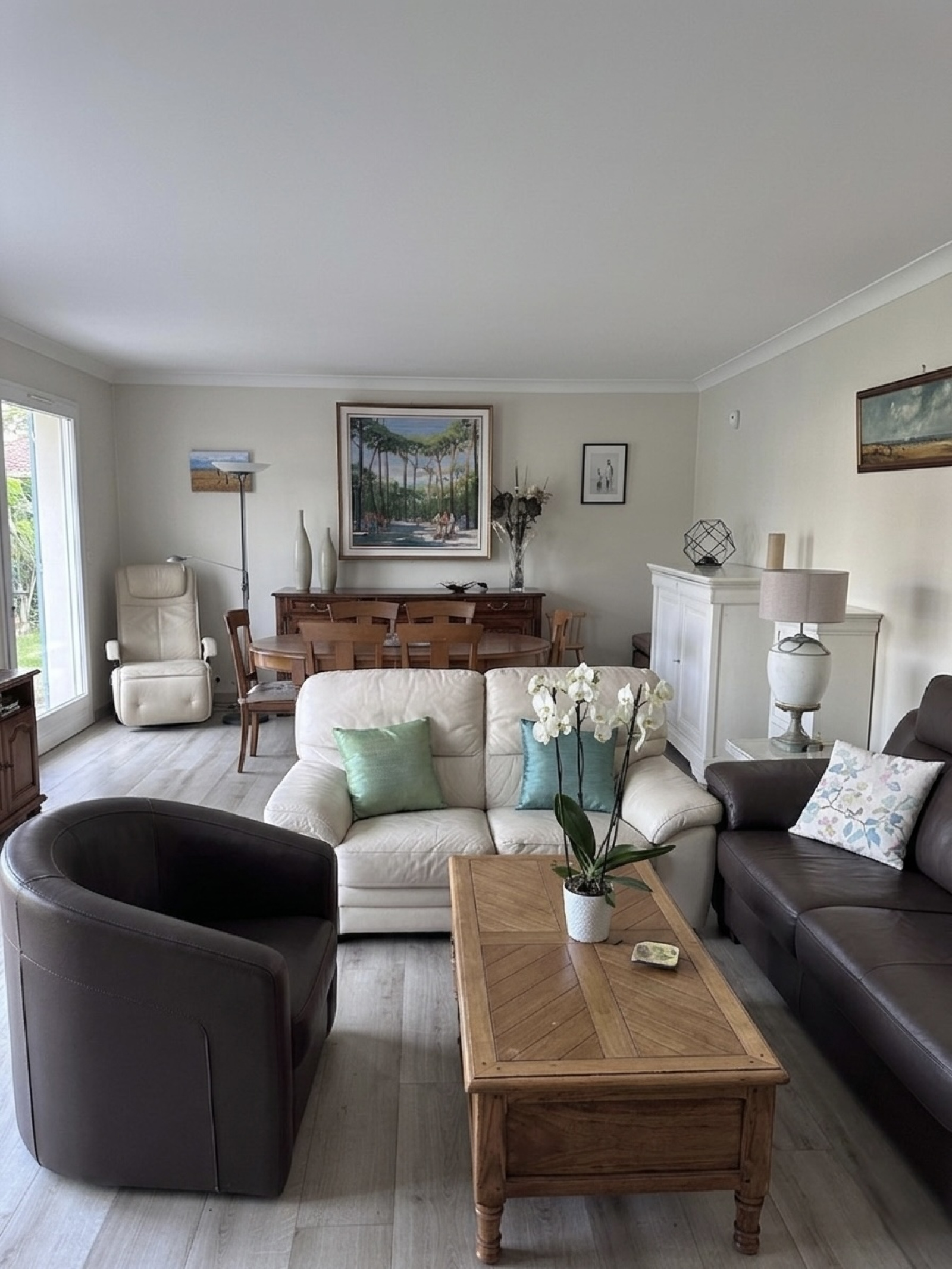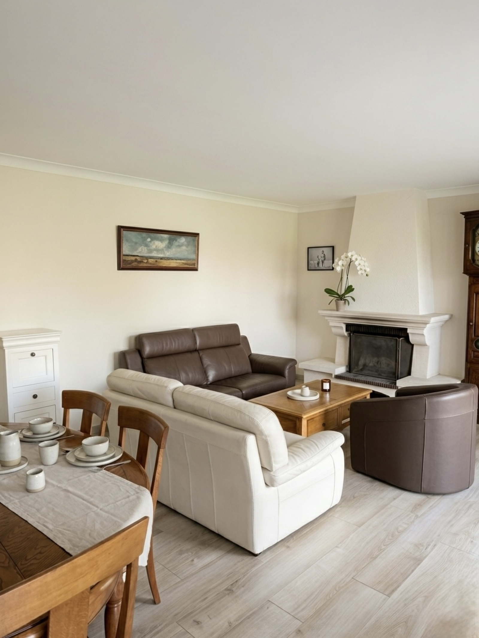 Le rez-de-chaussée accueille un vaste séjour lumineux avec une cheminée, une cuisine indépendante équipée, ainsi que deux chambres avec placards — idéales pour une chambre parentale ou un bureau. Ainsi qu’une salle de bains et un wc.