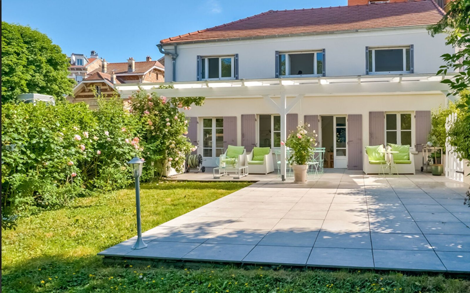 Édifiée sur une parcelle de 460 m²exposée plein sud, elle est sublimée par un jardin paysager unique agrémenté d’une pergola conviviale et d’un véritable écrin botanique : rosiers, pierres de Ronflore, hortensias, jasmin, ainsi que l’ombre bienveillante d’un magnifique cerisier voisin.