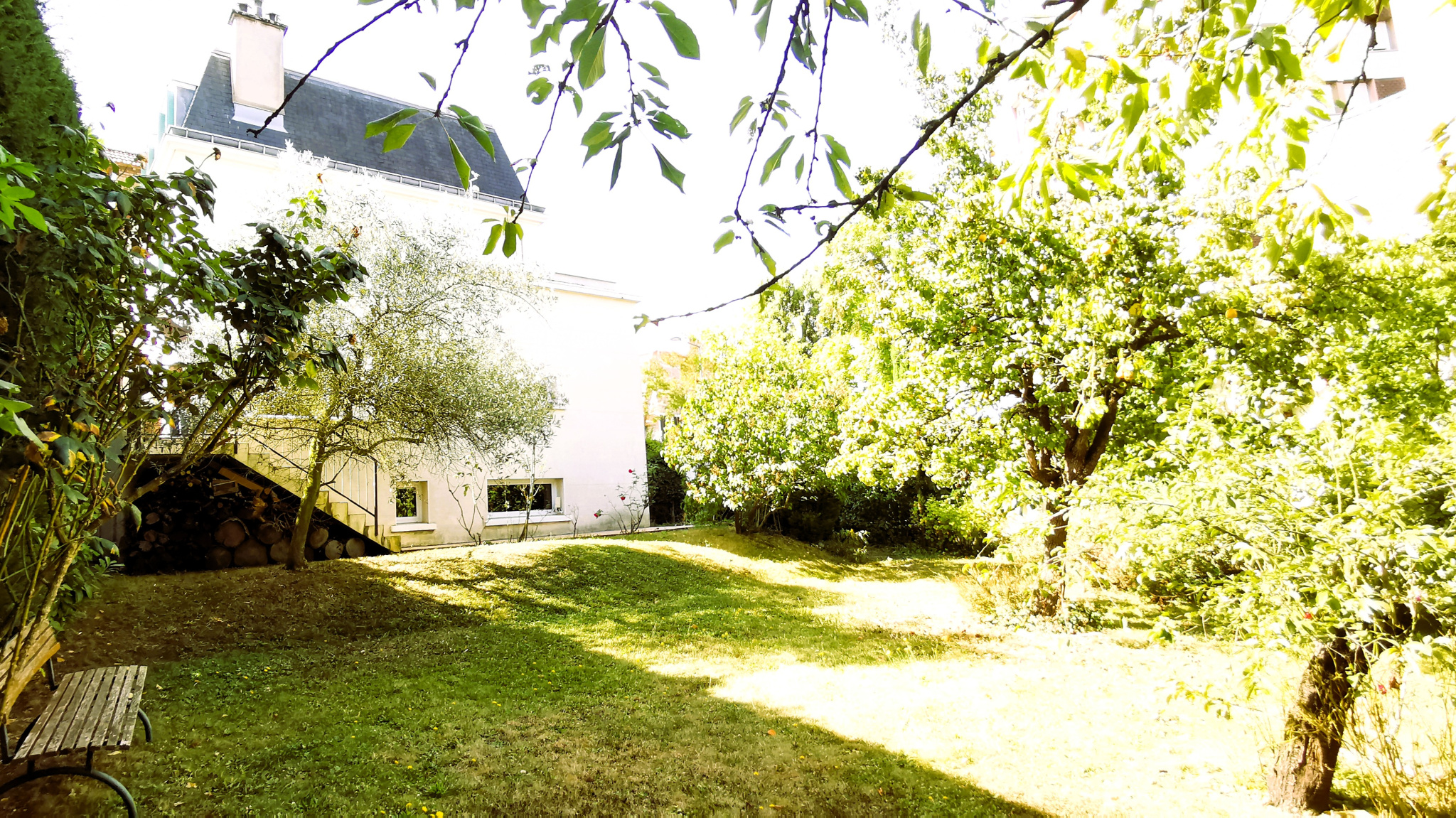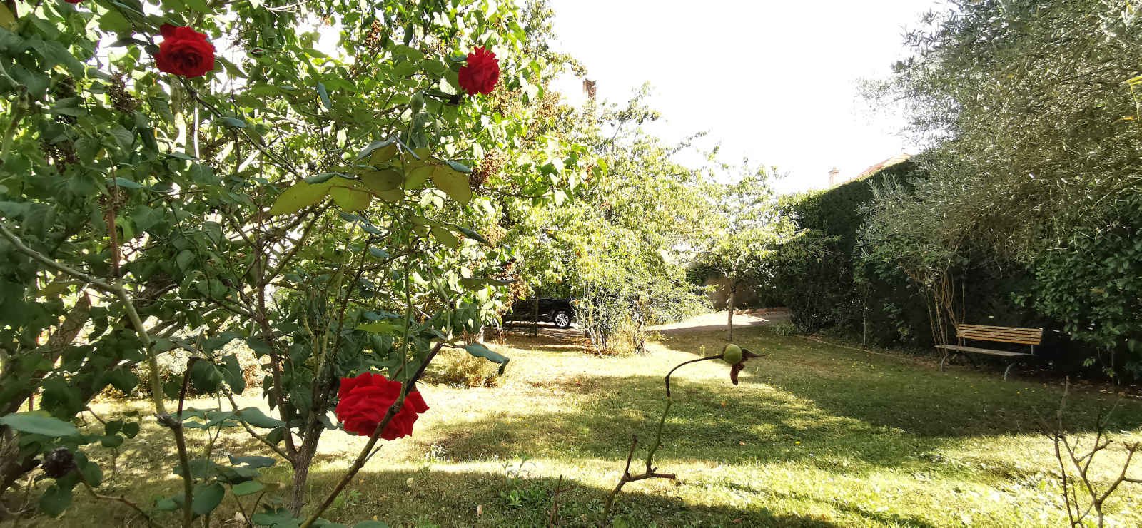Jardin spacieux de plus de 400 m², avec arbres fruitiers et rosiers