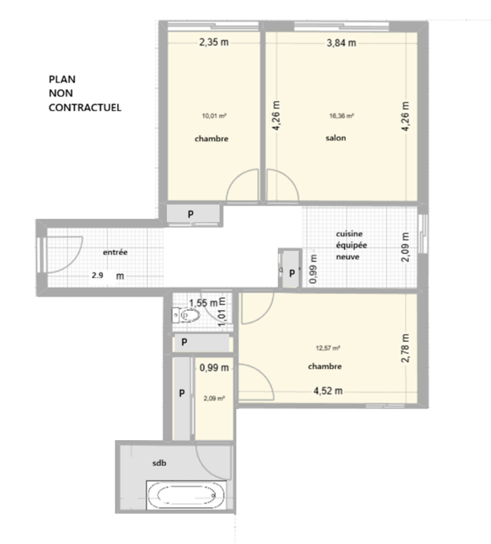 NOTA : Mur entre salon chambre et mur entre salon cuisine non porteurs, tout comme les placards du couloir.