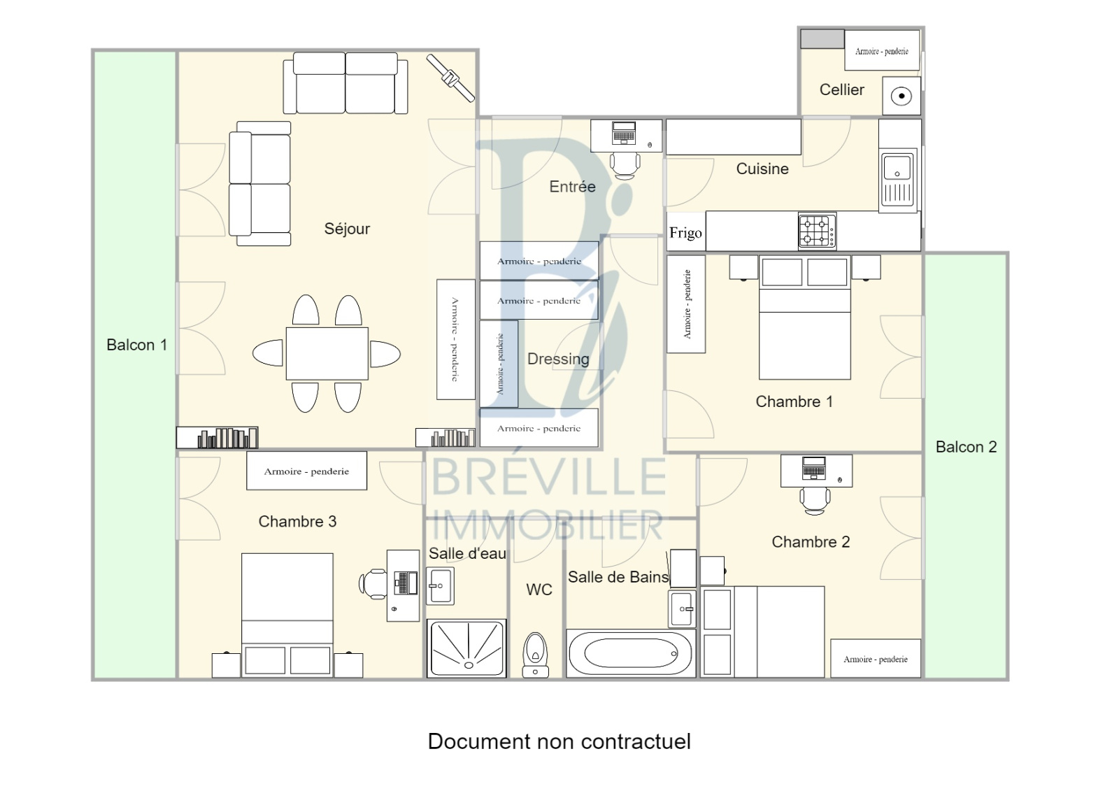 un séjour sur balcon, cuisine indépendante aménagée et équipée, cellier.