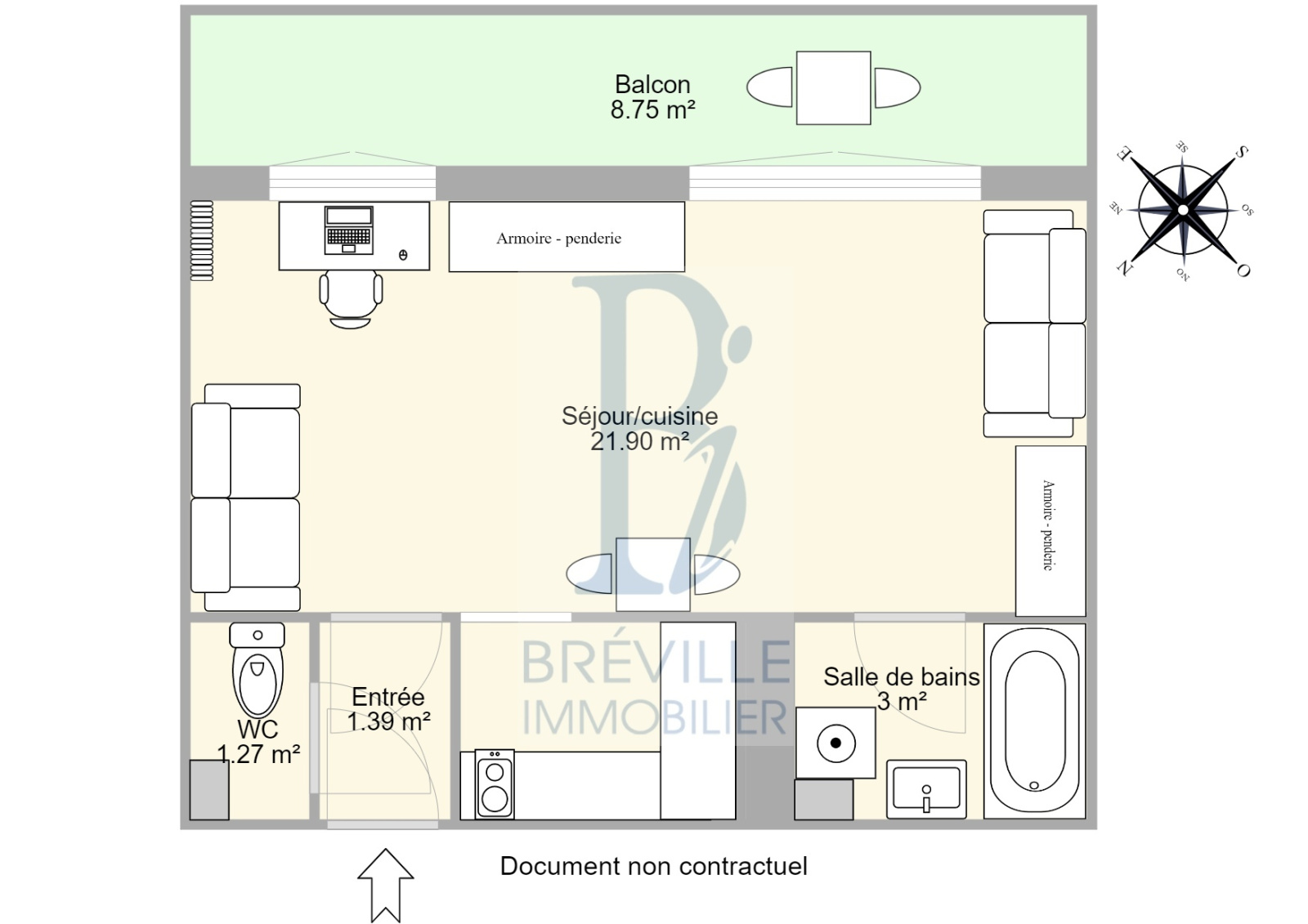 Lumineux Studio de 27.5 m² situé au 3ème étage sans ascenseur, comprenant : entrée, pièce de vie de 22m² donnant sur un balcon orienté SUD/EST de 8.75m² sans vis à vis, cuisine, salle de bains et WC indépendant. Une cave.